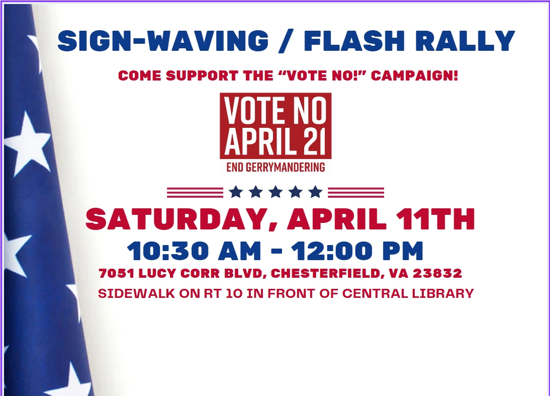 Join us this Saturday (April 11th) in Chesterfield to sign-wave/rally to raise visibility of the redistricting referendum with your fellow county residents. We’ll be on the public sidewalk on Route 10/Ironbridge Rd in front of the Central Library early voting location from 10:30 AM – 12:00 noon. It would be great to have some other republicans in Chesterfield rally the voters to get to the polls, so please come out for any portion of the 90 mins you can manage. We hope to see you there!